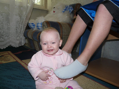 She also kissed on command again, her baby book, and a toy, but NOT HER MOMMY! What is UP with that? She won't give me any kisses! However, she did sit and snuggle with me for a long time today, after reading books. She was in a snuggly mood-I think it was the weather. :) We also had fun dancing and she rested her sweet lil head on my shoulder. So, I guess I can't complain too much about the kisses, but still....